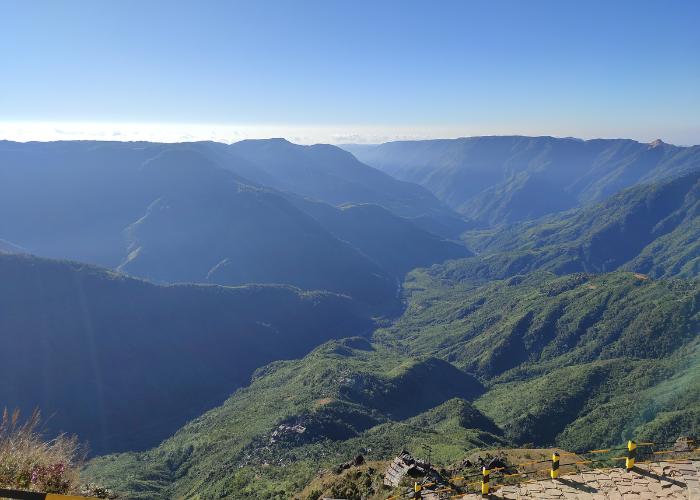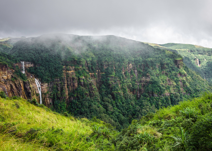 The distance between Shillong and Cherrapunji is around 50-55 km, and it takes approximately 1 hour and 30 minutes to reach. The entire route is filled with lush green nature, mist-covered hills, and deep gorges.